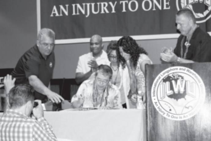 Kozo Matsumoto, President of the All-Japan Dockworkers Union, Zenkowan, leads a militant, democratic, and progressive union that recently engaged in a series of oneday port strikes and provided critical support for ILWU Local 142 Pacific Beach Hotel workers in reaching their first contract settlement. President Matsumoto renewed the Solidarity Agreement by signing the “Friendship and Solidarity Statement” with ILWU President Robert McEllrath in front of delegates.