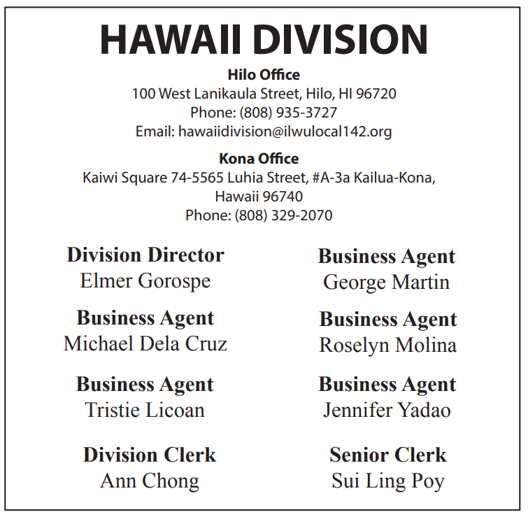 As the saying goes, “If you don’t ask, you’ll never know.” Here at ILWU Local 142, we want our members to be in the know. As a member of ILWU Local 142, you can rest assured that one of the Division Clerks will answer your call at every Division Office from 8 am to 4 pm, Monday through Friday.